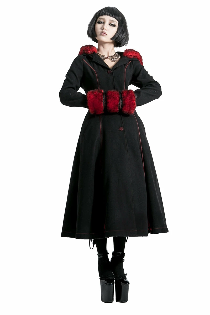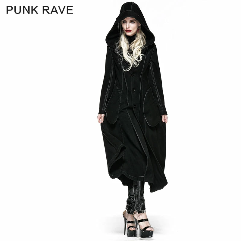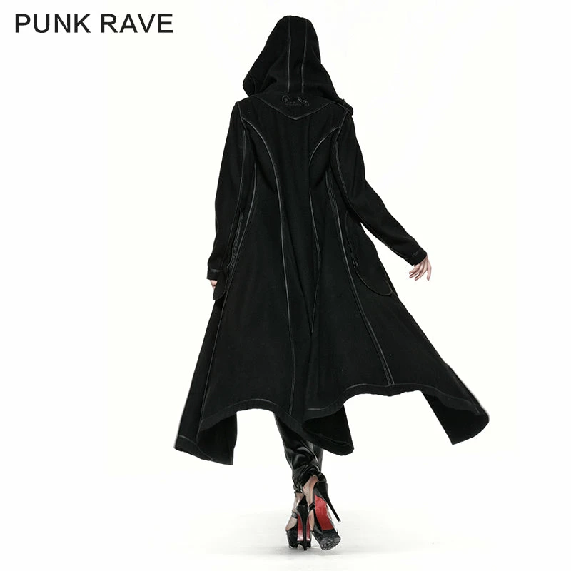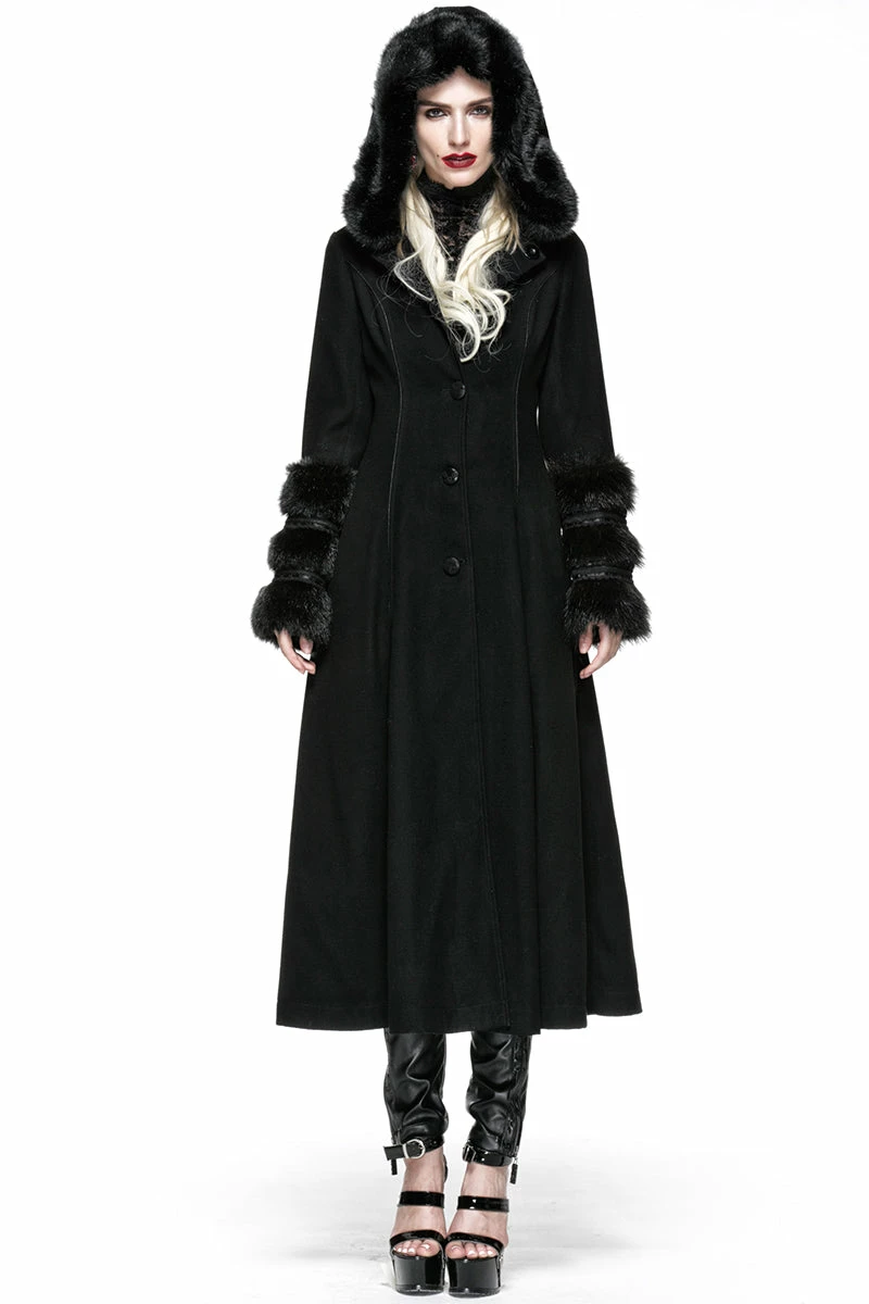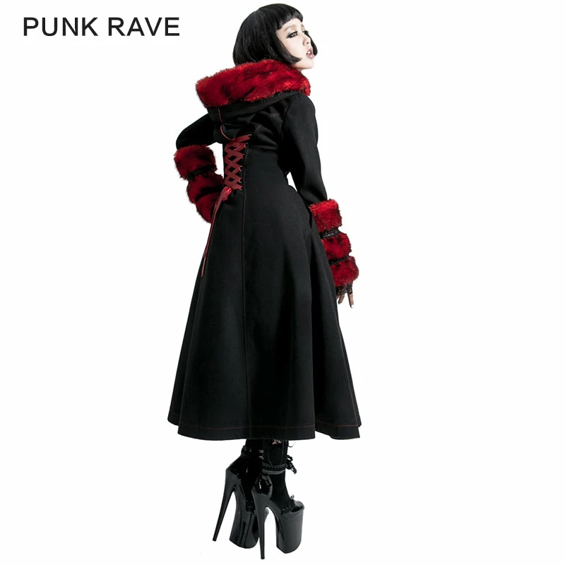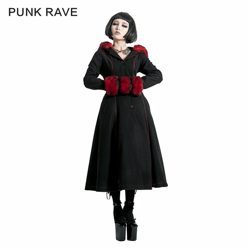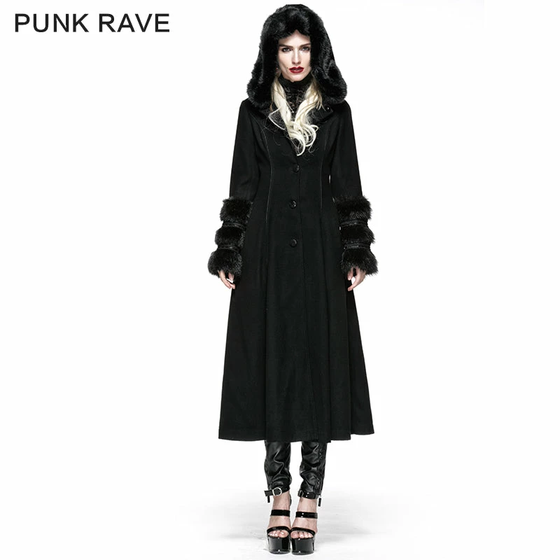 Punk Rave Store Gothic Lolita Winter Woolen Long Black Gothic Coat For Women Two Wear Imitation Fur Coat