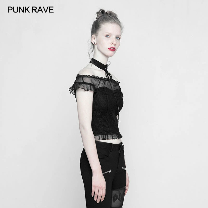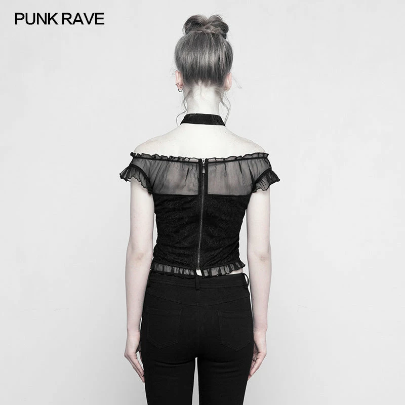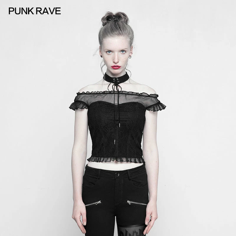 Punk Rave Store Soft Lace Imitate Silk Wrinkled Stitching Off Shoulder Tops Gothic T-shirt For Women