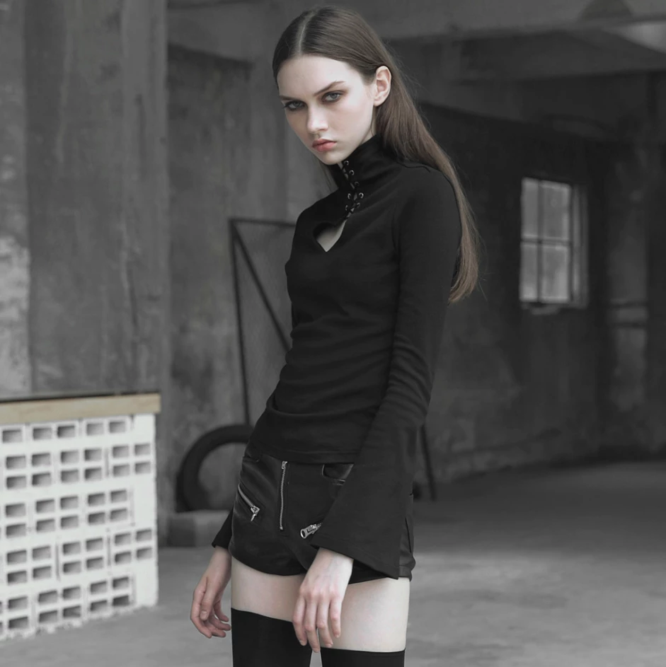 1.Small high-collar, horn sleeve, more women 2.Front-chest chicken-eye rope binding, hollow design, dark, sexy ,personality. 3.Tight waist, slim Fabric selling points: 1: Grinding elastic knitting, comfortable and warm.