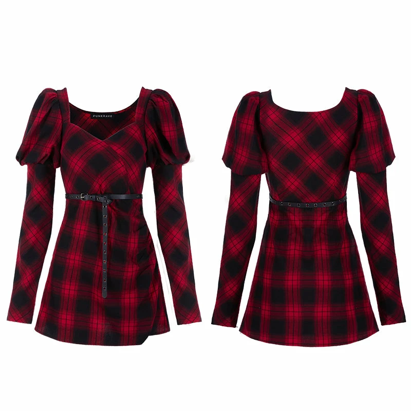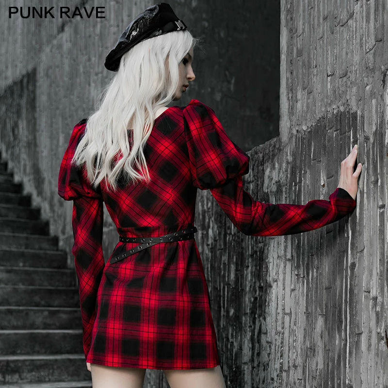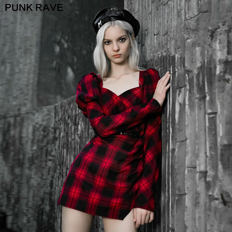 Design selling points: Fake Cross fixed neckline, which is not easy to exposed.2. tight waist version, tiny skirt with side zipper 3.Princess sleeves are sweet and elegant, the inner side is Black lace hanging sleeves,the sleeves are more solid with the support. 4. The lower sleeve and the front chest and back are diagonal plaid cutting fabric, it’s more slim in sight. 5.Single side slit pleated leg opening is more sexy. 6.Detachable Punk metal corn-eye belt. fabric selling point:woven fabric, moderate thickness, tight pattern.